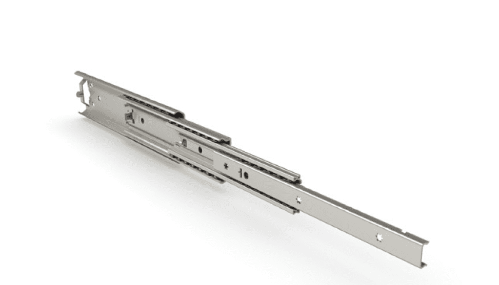 為全部伸出伸縮滑軌由冷軋低碳鋼製成,與滾珠軸承保持架連接,並經過符合 ISO 2081 防腐蝕鍍鋅和藍色鈍化處理。內部擋塊具有保持關閉的功能,可減少噪音並防止滑軌在閉合位置自行打開。